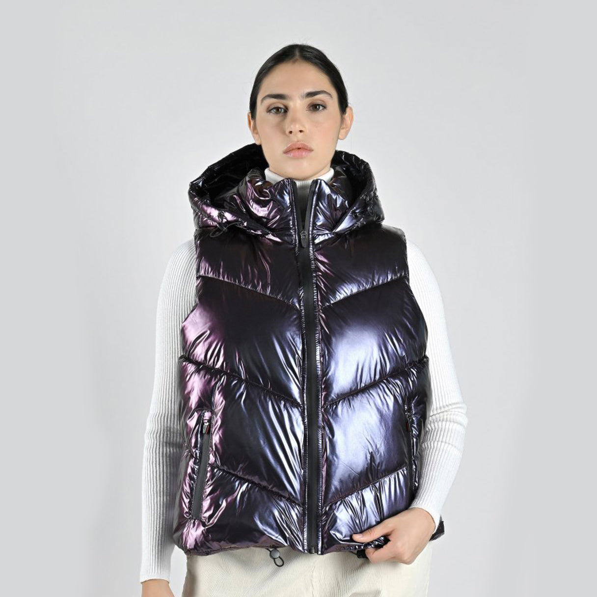 Recycled vest for women A distinctive and lightweight shell jacket with a glamorous twist. Canadian keeps discovering fresh and innovative ideas for unique outerwear and this new model is certainly no exception.